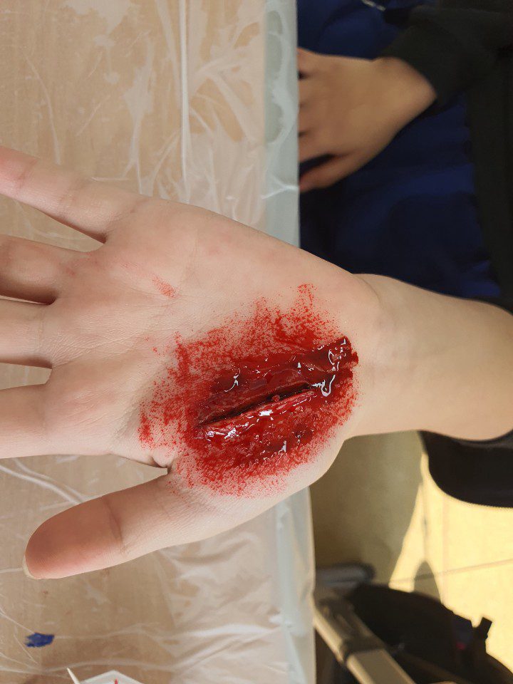인조피로 색을 입혀 칼로 베인상처를 실감나게