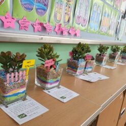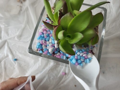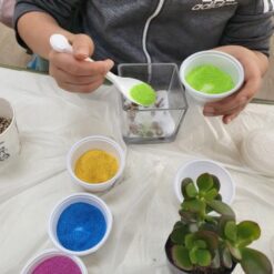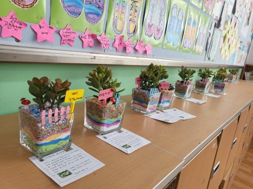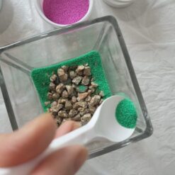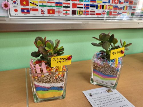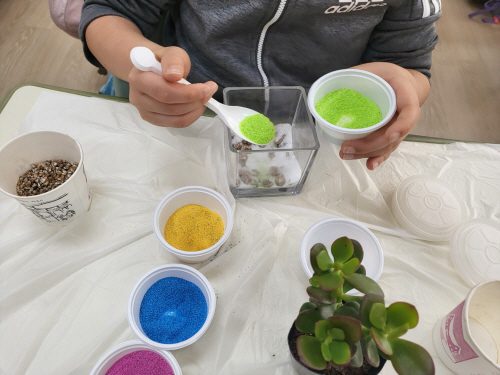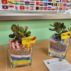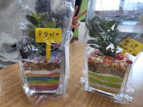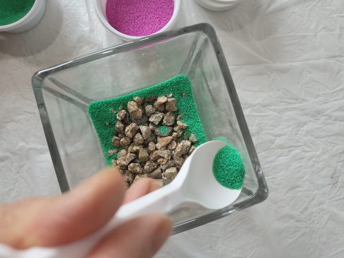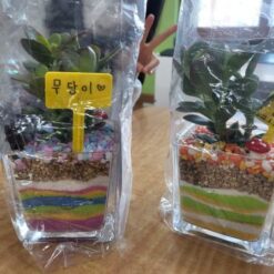 유리용기에 색 모래를 층층이 쌓고 식물을 심어 유리 테라리움 만들기