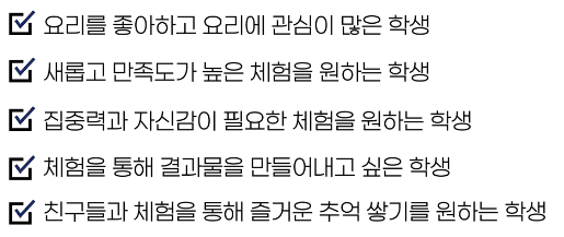 요리체험 프로그램은 성취감과 자신감은 물론 집중력과 창의력을 길러줍니다.